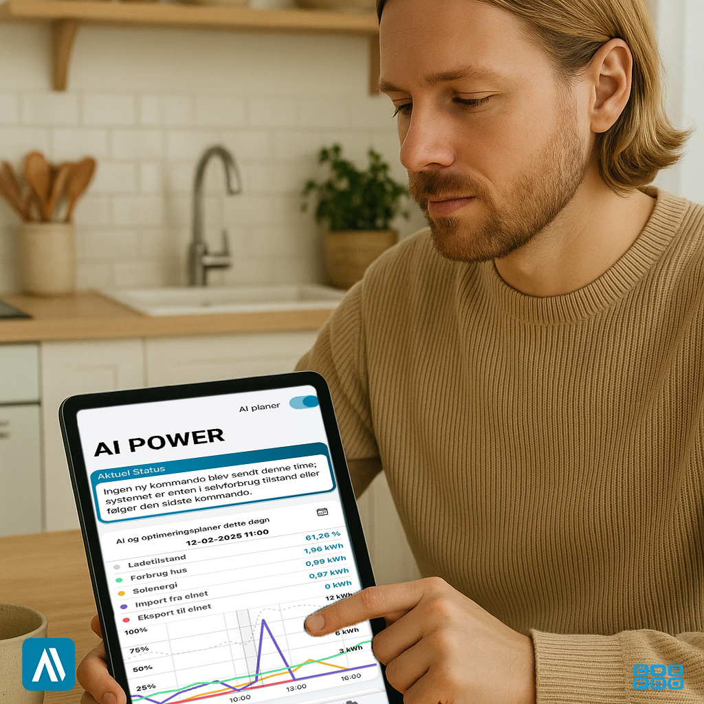 På en sommerdag oplader systemet batteriet midt på dagen ved lave priser og grøn produktion, og bruger energien i aftentimerne når priserne er høje. Det sænker elregningen og CO2-aftrykket uden at ændre daglige rutiner.